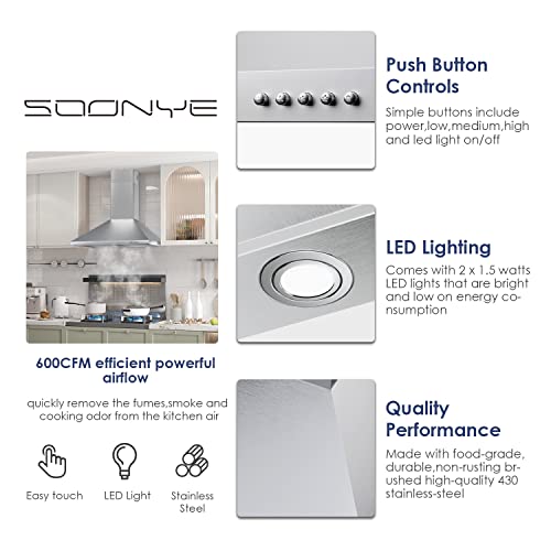 【One Year Warranty】 – SOONYE range hoods provide 1 year manufacturer warranty with your purchase. If you have any questions, please refer to customer service information in the user manual.
