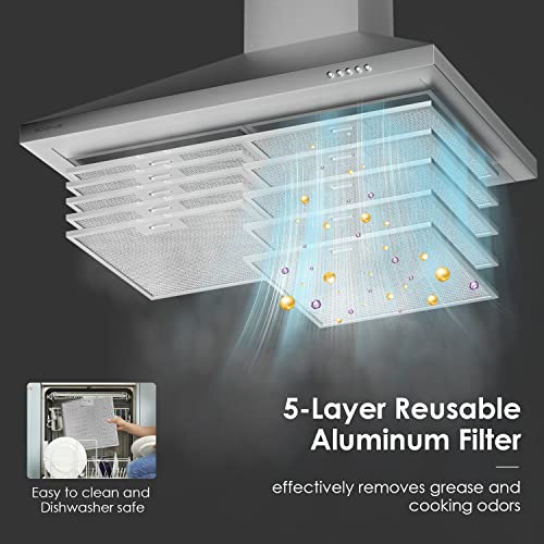 【Easy to Clean】 – This great quality range hood constructed with premium for 430 grade satin finished brushed stainless steel, which is resistant to high temperatures, salt corrosion and easy to clean.