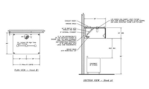 Manufactured in the USA. One year warranty. Technical support available upon purchase. As all hoods are custom built, no returns or exchanges are accepted. Exhaust fan and fire suppression system not included.
