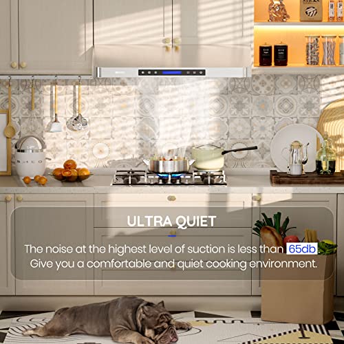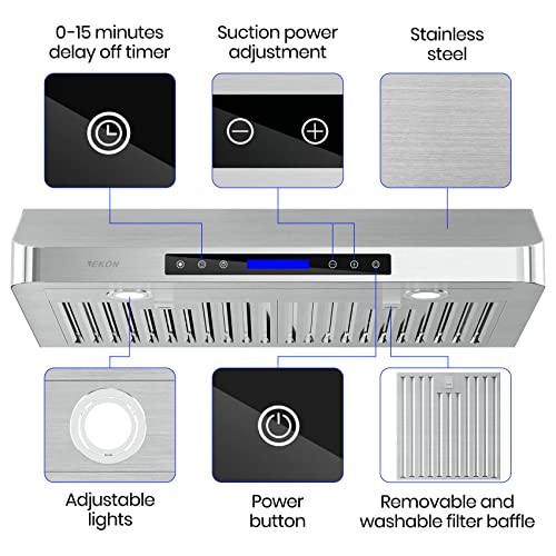 EKON 42 inches Under Cabinet Range Hood, 900 CFM Stainless Steel Kitchen Chimney Vent, 4 Speed Touch Screen Control With Remote 2Pcs 3W LED lights Dishwasher-safe Filters Fan Timer