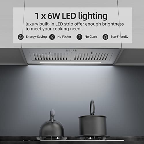 QUIET AND WORK EFFICIENTLY 30 INCH RANGE HOOD: Quiet operation keeps noise level less than 57dB at high speed. 3 Speed kitchen exhaust fan suitable for most kitchens, quickly removes grease and fumes.Let you enjoy a good time cooking. Range hood with 1 x 6W LED lighting luxury built-in LED strip illuminate the cooktop and are brighter and more energy efficient.