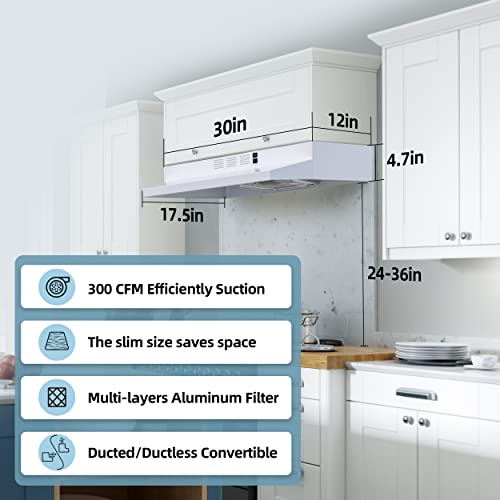 FIREGAS Range Hood 30 inch Under Cabinet Range Hood with 2 Speed Exhaust Fan,Ducted/Ductless Convertible,Rocker Button Control,300 CFM, White Vent Hood Aluminum Filter Included