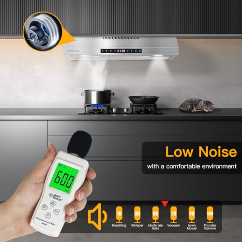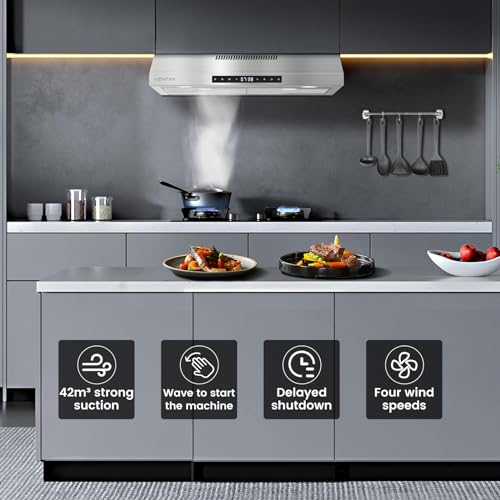 Contemporary Smart Design: Ventless range hood with gesture sensing & touch control panel and comes remote control, clear digital screen. Stove vent hood has novel gesture sensing function gives you a whole new experience for hassle-free control, giving your kitchen a modern, restaurant-like feel.