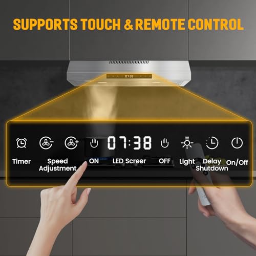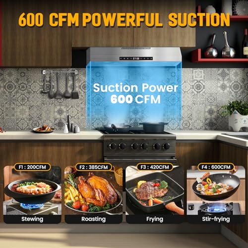 600 CFM Stove Hood Vent: Under cabinet range hood featuring with dual motors and good balance fans, 600 CFM hood vents for kitchen efficiently removing oil fumes and harmful carcinogens, reduce the damage to your skin and health, improving air quality significantly.