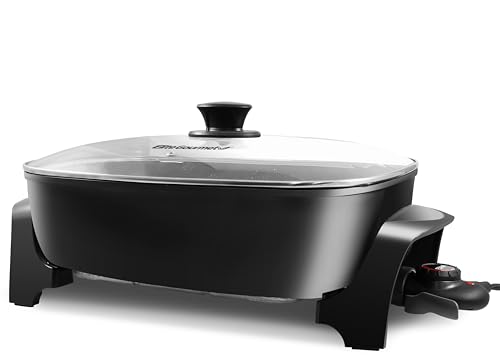 SAFETY TESTED ETL listed 1500 watt/120V electric skillet is ideal for home kitchen use; 3.15″ splatter-proof walls and cool-touch knob and handles make this an essential and thoughtful housewarming or wedding gift
