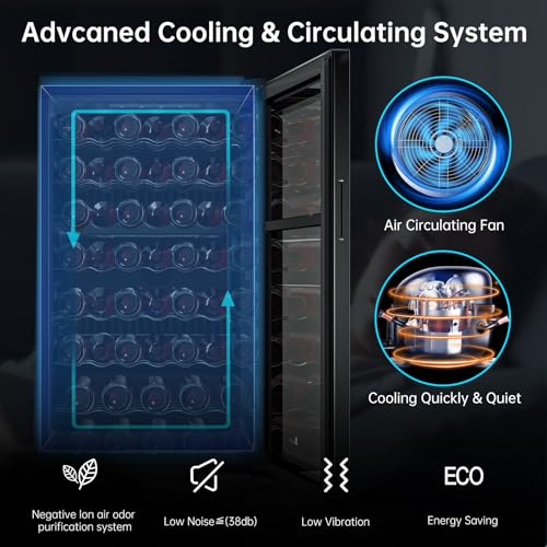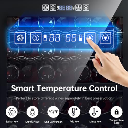 Temperature Control: Enhance your wine storage with our advanced dual-zone cooling system, perfect for red and white wines. Customize temperatures for each bottle—upper zone (41-50°F) and lower zone (50-64°F)—to preserve your wine collection’s flavors and aromas.