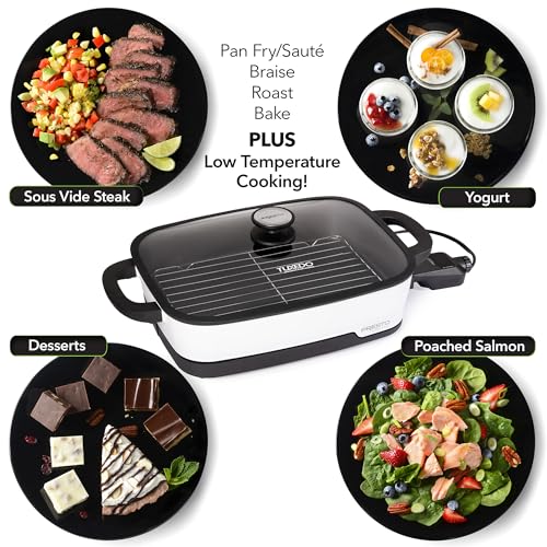 The Tuxedo™ 16-inch precision skillet with digital heat control takes skillet cooking to an exciting new level. The digital interface with large LED display lets you choose exact temperatures from 100° to 400°F for precise heat regulation, even at low temperatures. Extra-high sidewalls with ultra-durable ceramic surface makes this skillet ideal for pan frying, sautéing, roasting, braising, steaming, simmering soup and stew, poaching, sous vide cooking, making yogurt, and proofing dough. Select temperatures in one degree increments from 100° to 205°F and five degree increments from 205° to 400°F for consistent results every time. The multi-purpose rack is used for steaming and sous vide cooking, as well as making yogurt and baking potatoes. The skillet’s spacious 16-inch base assures added cooking and serving capacity. With sophisticated styling, a tempered glass cover with silicone rim, and easy-grasp handles, the Tuxedo™ skillet is both stylish and functional when entertaining. The digital control keeps food at precise serving temperatures for up to 24 hours. The ceramic nonstick surface, inside and out, makes cleaning a breeze. Skillet is fully immersible with the digital control removed. Delicious recipes included for pan frying, braising, poaching, sous vide, yogurt, desserts, and much more.