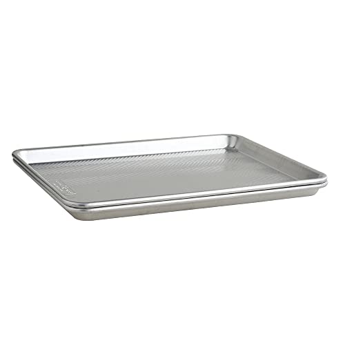 Embossed grid pattern enhances the look and performance of our hugely popular baking pans. Exclusive Prism grid adds durability and provides easy release while also improving air flow for uniform crisping. Natural aluminum affords the best possible heat dispersion to create perfectly browned baked goods every time. Encapsulated galvanized steel rims prevent warping. Pan should be hand washed or discoloration will occur. If any discoloration occurs during hand washing or baking this is merely cosmetic in nature and will not affect baking performance. Made in USA.
