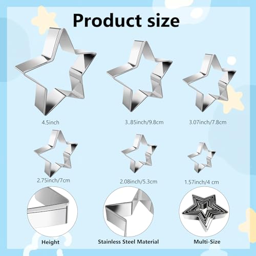 PACKAGE INCLUDE: 6 Piece Star Shaped Cookie Cutter Set,1.57inch/4 cm,2.08inch/5.3cm,2.75inch/7cm,3.07inch/7.8cm,3.85inch/9.8cm.6 kinds different size,super cute and festive cookie cutters are perfect for a star war holiday themed party to DIY and decorate the cookies or cakes.