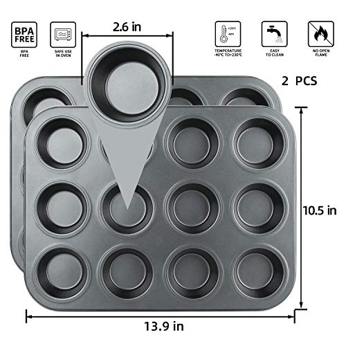 Muffin Pan, 12 Cupcake Pan, 2 Pack Nonstick Bakeware Muffin Tin Sets, Baking Pan for Kitchen Oven. Product Introduction: Everyone should try baking a few times. Maybe you can’t be a baking master, but you can definitely experience the fun and benefits of baking. Either it enriches your life, or it makes you make friends, or it enhances the relationship between you and your family, or it satisfies your craving for sweets. At least, it must enrich the conversation between you and your friends. Features and Benefits: High-quality carbon steel structure muffin pans,Anti-warpage,With excellent thermal conductivity, the muffin pan is heated evenly. Cupcake pan are easy to clean (hand wash is recommended). Non-stick coating can release food easily,Cupcake Pan can be used safely in a 428 Degree F oven. Cake tray for easy storage. The two-piece set of high-quality carbon steel structure muffin trays is extremely cost-effective. Specification: Dimensions : 13.9 x 10.5 x 1.2 inches. Individual cavity dimensions : 2.9 x 1.18 inches.( Opening Diameter x Depth). Colour : Black Packing List : 2 x Muffin pans Material : Carbon Steel+Non-stick Coating Safe & Healthy : Food-grade coating, PTFE, PFOA and BPA free. Notes: We recommend to wash the cupcake tin in warm, soapy water before first and after each use, then rinse and dry thoroughly with soft cloth,hand wash recommended. With food grade standard production, the of our bakeware is longer. Professional Service Team: Please feel free to contact us for replacement or refunds if there are any issues with your Cupcake Pans. All our products are under strict quality inspection. technical support. You want it now. Go buy it soon!?