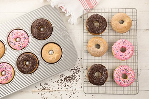 The USA Pan 6-Well Donut Pan measures a full 3.5 x 3.375 x.875 inches* in each well and is perfect for baking mouthwatering homemade donuts. Skip your trip to the bakery and bite into a classic old-fashioned donut, pumpkin cake donut, or powdered donut that is fresh from the kitchen oven. The pan surface is coated with a patented AMERICOAT Plus coating, a non-stick silicone, allowing you to easily release your baked goods from the pan. AMERICOAT Plus is PTFE, PFOA and BPA free. Every USA Pan is made in the USA and has been designed with the same standard high performance features that commercial bakers enjoy including aluminized steel and heavy gauge steel construction that allows for even heat distribution and maximum service life. USA Pan 6-Well Donut Pan’s unique fluted panel surface design facilitates air circulation and also maximizes pan strength, which helps to resist warping. USA Pan bakeware is long-lasting, durable, reliable. USA Pan’s professional grade bakeware helps everyday home bakers produce professional grade baked goods. USA Pan is a Bundy Family owned company, based in the Greater Pittsburgh, Pennsylvania area that has been producing high performance bakeware for over 50 years. *Dimensions represent baking surface, not overall pan size.