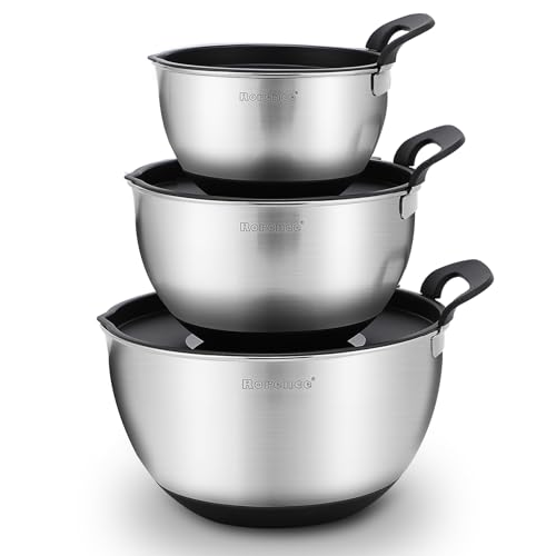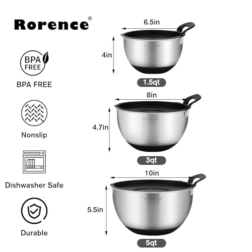 Rorence Stainless Steel Mixing Bowls: Stackable Mixing Bowl Set with Lids and Handles Non-slip Silicone Bottom Nesting Bowls for Kitchen Set of 3 – Black