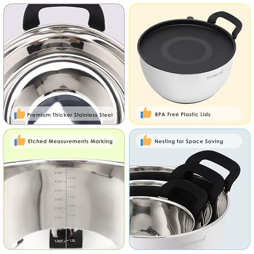 【Unique Design, Combine Practicality with Elegance】 The silicone handles make the bowls easier to hold down on a surface when mixing. The non-slip silicone bottom ensures the bowls will stay in place when you mixing. Inner measurements with quart and liter markings for easy measuring. The spout allows for easier pouring. The fitting lids for all bowls keep your food fresh and prevent messes