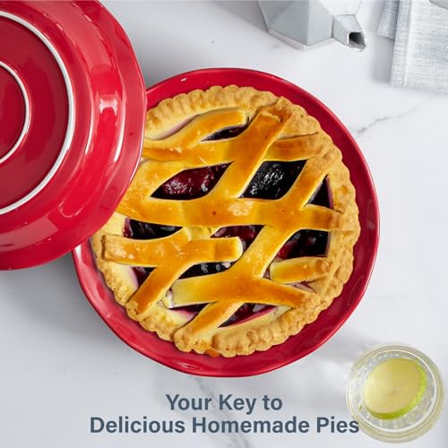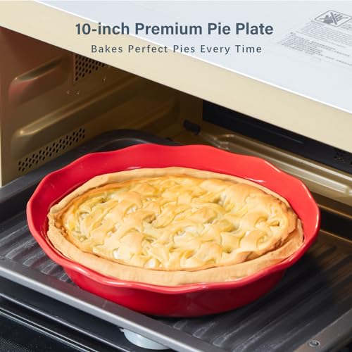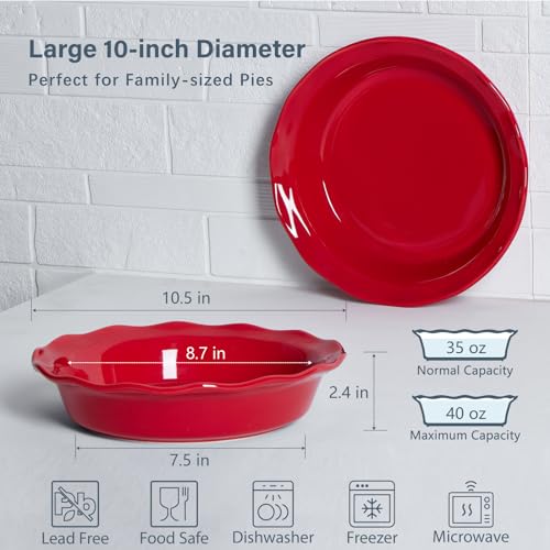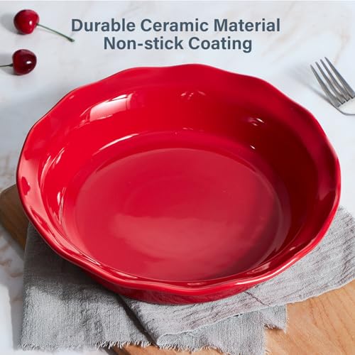 ONEMORE Pie Pan, Deep Dish Pie Pans for Baking 10 inch Large Pie Plate Ceramic Baking Dish Oven Safe | Ruffled Edge – Perfect for Chicken Pot Pies, Tarts, Quiches, Pizzas, Cakes – Red