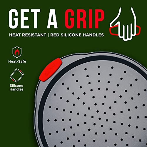 Pizza Tray – 2 Round with Silicone Handles – Carbon Steel Pizza Pan with Holes and Non-Stick Coating – PFOA PFOS and PTFE Free by Bakken