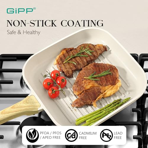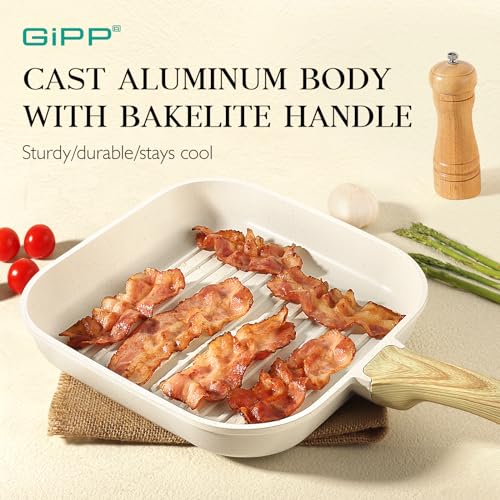 GiPP Nonstick Grill Pan for Stove Tops – 11 Inch Square Grilling Pan for Indoor Cooking & Outdoor Grilling, Non Stick Granite Grill Skillet Steak Pan, PFOA Free, White