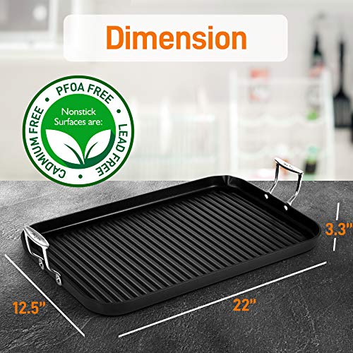NONSTICK COATING: The 20″ x 13″ nonstick grill pan cookware features a non-stick coated layer surface that ensures quick, effortless food release and eliminates the need for butter, oil, or cooking spray. Makes tasty homemade food slide out easily