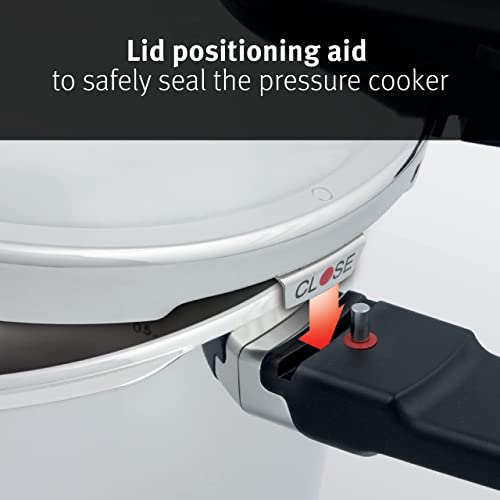 Safety: With the pressure release feature at the pressure indicator and the control button at the side of the safety handle, pressure can easily be released as needed. The Locking indicator switches audibly (click) from red to green once the pot is correctly and securely sealed.