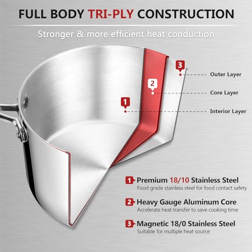 【TRIPLE PLY】 Heavy duty tri-ply construction –the 18/10 stainless steel interior layer for food contact safety, Heavy gauge aluminum core to distribute heat efficiently and evenly, The outer layer of 18/0 stainless steel is magnetic, Which means this saucepan will compatible with all of your cooktops, Multi-layer composite design ensures excellent heat transfer and saves cooking time