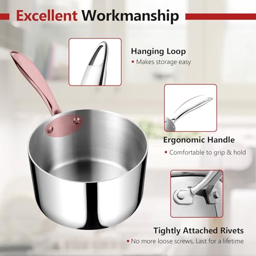 【EASY TO USE & CLEAN】 This induction saucepan suitable for both beginners and chefs, It can do everything like melting butter, cooking pasta, making soup, frying doughnut and preparing sauces, Perfect for daily meal prep, Clean up can be super easy, As it is dishwashersafe, The internal brushed surface and external mirror surface are smooth, Hand washing with soapy water also without difficulty