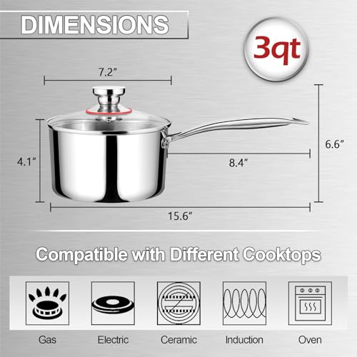 【PREMIUM MATERIAL】 Our 3 quart suacepan is constructed from heavy gauge 18/10 stainless steel, Rust resistant and sturdy, Without any coating, Will not react with food, No chemicals or toxic materials will release even at high temperature, Healthier than aluminum or nonstick coating cookware, Durable & safe for long-term use