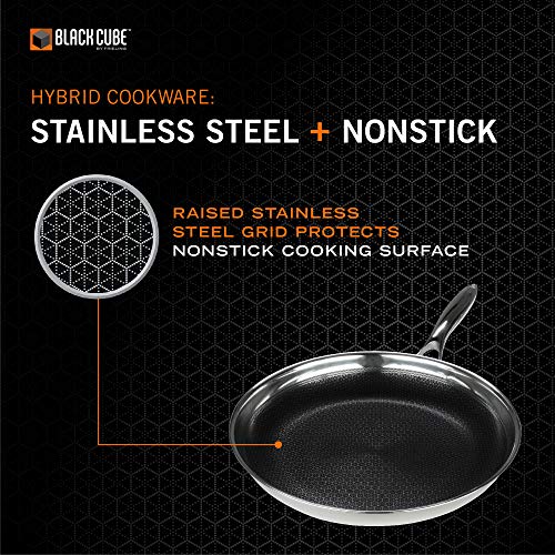 HYBRID PAN: Welcome to the world’s first hybrid frying pan with the ultimate cooking surface. This pan cooks like stainless steel and cleans like a nonstick pan. Black Cube cookware features a textured surface for superior browning that is easy to clean. With this revolutionary new cooking surface, you get all the benefits of stainless steel and nonstick cookware with no compromise.