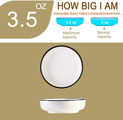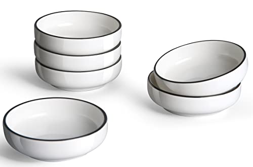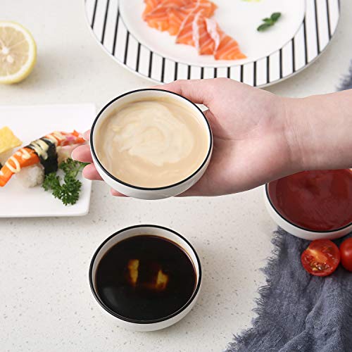 DIPPING SAUCE DISHES, ROUND SOY SAUCE DIPPING BOWLS – 6 Packs, Black rim with White, 3 oz capacity is suit for dip, sauce, Sushi service. Black rim dish could make you more focused on food when you are eating or taking a nice food photo.