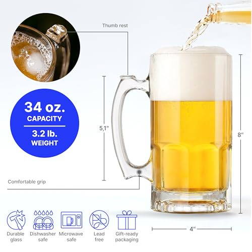 Generous Capacity: With a whopping 34 oz capacity, this large glass beer mug allows you to enjoy more of your favorite brew with each pour. Measuring 8″H x 4″Dia, each stein weighs 3.2 pounds.