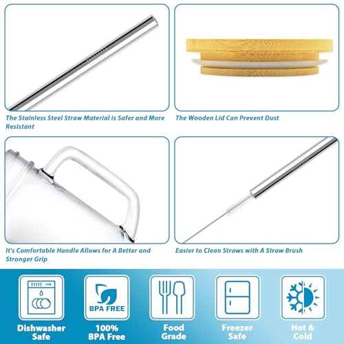 đŸ„€ă€GLASS CUPS WITH LIDS AND STRAWS】This simple and stylish glass comes with a comfortable handle for a better and stronger grip. The glass comes with a stainless steel straw and a wooden lid, the stainless steel material is safer and more resistant to drops, and the wooden lid can prevent dust.