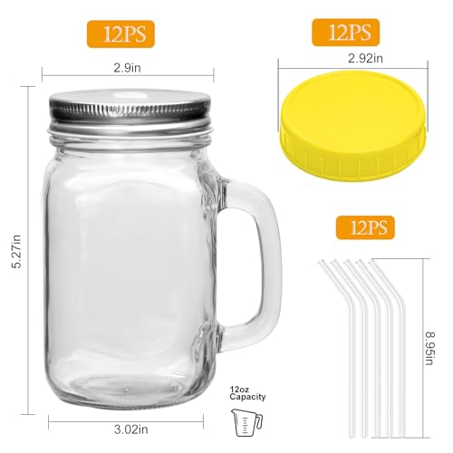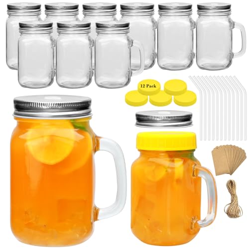 QAPPDA Mason Jars with Handle, Glass Mugs with Straws and Sliver Lids 12 Pack,16oz Drinking Jars,Smoothie Cups for Juice,Coffee,Iced Tea and Lemonade
