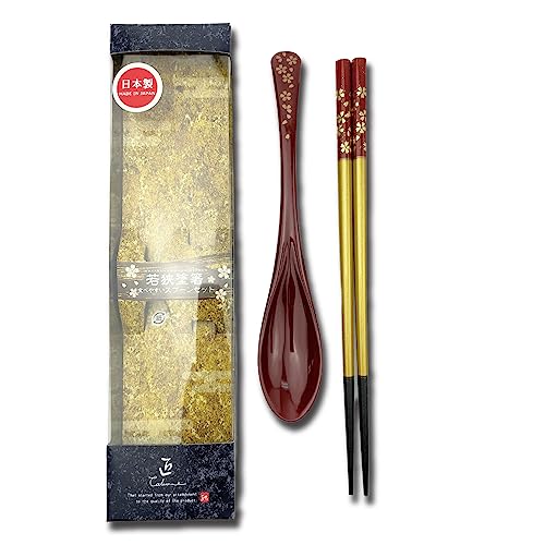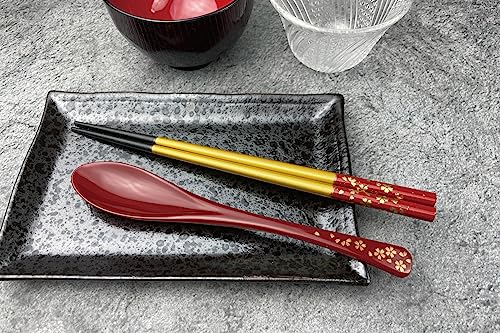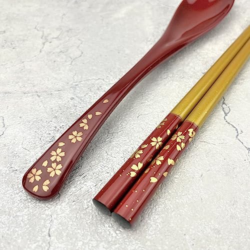 Premium Japanese Chopsticks with Spoon Reusable [ Made in Japan ] Traditional Lacquer Art Wooden Chopsticks B (Cherry Blossom RD(TSS06))