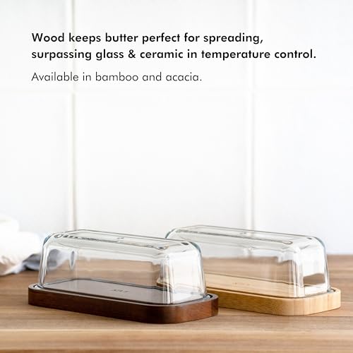 FSC CERTIFIED BAMBOO – Unlike traditional butter dishes, our modern butter holder with lid is completely plastic free. The small butter dish is made of high quality borosilicate glass and sustainable bamboo wood, which originates from an FSC certified forestry.