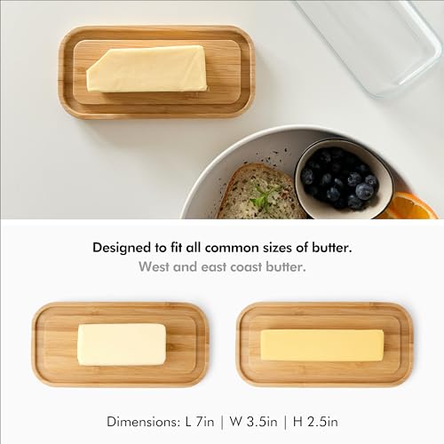 EASY TO CLEAN – The borosilicate glass lid is dishwasher safe and the bamboo plate of the butter stick holder is easy to wash with a damp cloth. Measurements of the KIVY glass butter dish with lid for countertop: L 7.2 | W 3.5 | H 2.5 in.
