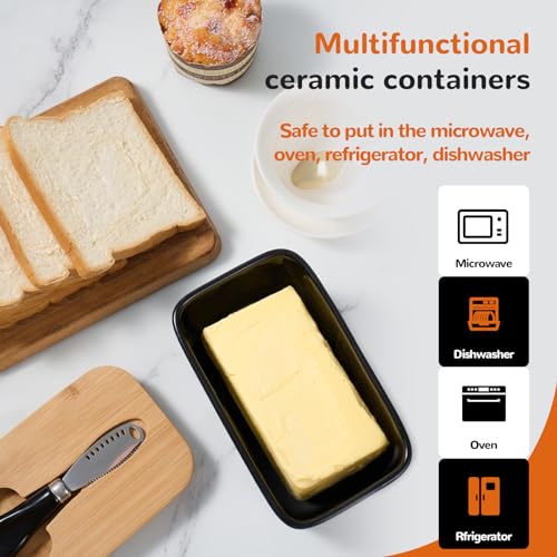 【Safe and High Quality】Our butter containers use safe and harmless Pro-grade non-stick porcelain. You can safely put them in ovens, microwave ovens, dishwashers, and refrigerators. Unlike synthetic materials, Our bamboo cover material is very hard and thick.it will not easy to age and damage, the blade on the groove of the butter cover is made of stainless steel to protect the health of you and your family.