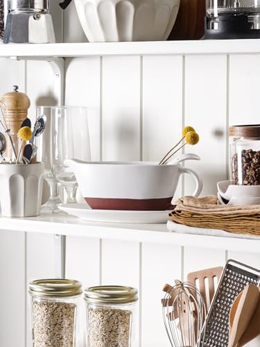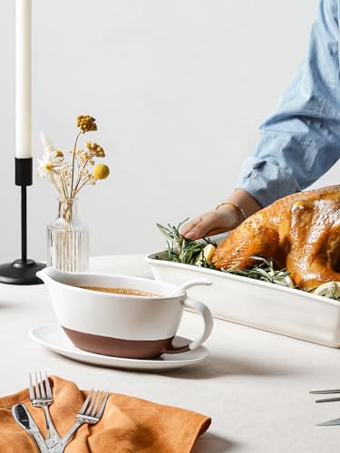 LE TAUCI 16 OZ Gravy Boat with Ladle and Saucer, Ceramic Gravy Bowl with Tray and Ladle for Christmas Dinner, Drip-Proof Lip Dispenser, Microwave and Dishwasher Safe, Brown-Red and White
