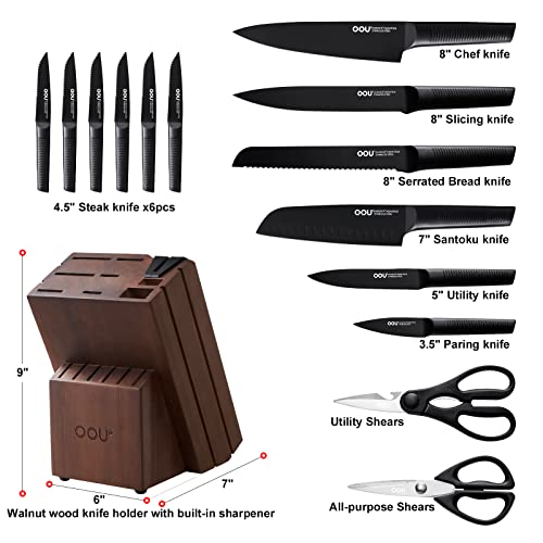 【PERFECT QUALITY KNIFE SET】 OOU 15 piece Knife Set includes:7″ chef knife, 7″ santoku knife, 8″ slicing knife, 8″ serrated bread knife, 5″ utility knife, 3.5″ paring knife, 6 PCS of 4.5″ serrated steak knives, kitchen shears, utility shears, and hard wood knife block with built-in sharpener.This knife set can be used for your daily kitchen tasks and fit all your needs.