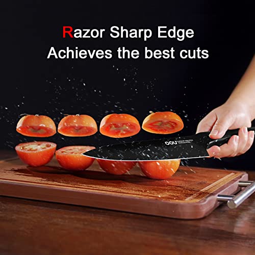 【HIGH TECH IN KITCHEN KNIVES】Patented BO Oxidation Surface suits an fantastic black oxide layer on OOU knife block set for true anti-rusting. Different from other black knives in the market, they may unhealthy and the black coating may chip off. All OOU Knives are safe for health and the black oxide layer will never be chipped off.