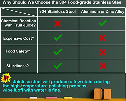 💯% 304 stainless steel, No coating falling off! please do not compare the price of our squeezer with the aluminum squeezer on the market, nobody wanna a discount on their HEALTH. (NOTE❗304 stainless steel will produce a few stains during the high-temperature polishing process, just wipe it off with water)