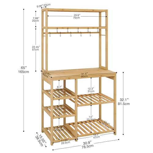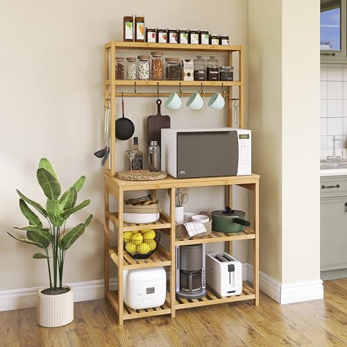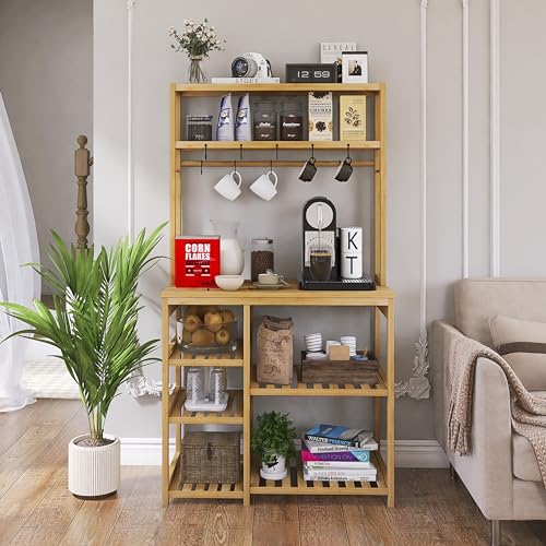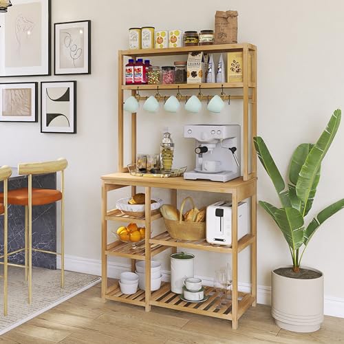 SMIBUY Kitchen Baker’s Rack, 6-Tier Bamboo Microwave Stand with Utility Storage Shelves, Coffee Bar Table Station, Kitchen Organizer Rack with 10 S-Shaped Hooks, 31.5 Inch Width (Natural)