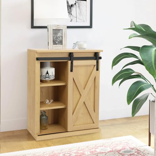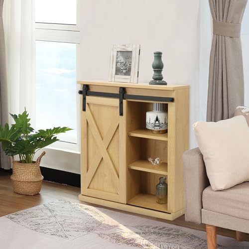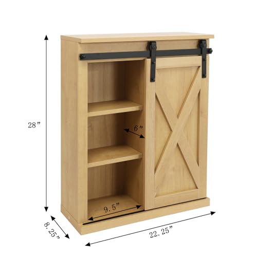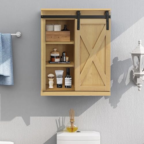 FLORA Rustic Wood Wall Storage Cabinet with Sliding Barn Door, Medicine Cabinet with Adjustable Shelf for Bathroom, Kitchen, Living Room, Brown