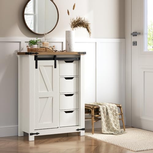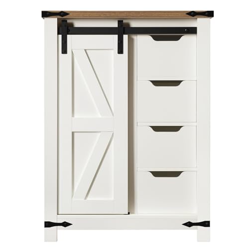 HOOBRO Bathroom Floor Cabinet, Farmhouse Storage Cabinet, Space-Saving Bathroom Cabinet with Sliding Barn Door and Drawer, Kitchen Storage Cabinet, for Bathroom, Living Room, Kitchen, White and Walnut