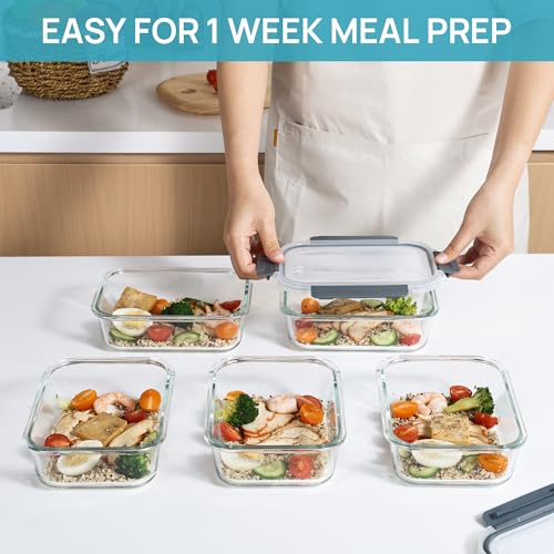 Vtopmart 5 Pack 22oz Glass Food Storage Containers with Lids, Meal Prep Containers, Airtight Lunch Containers Bento Boxes with Snap Locking Lids for Microwave, Oven, Freezer and Dishwasher