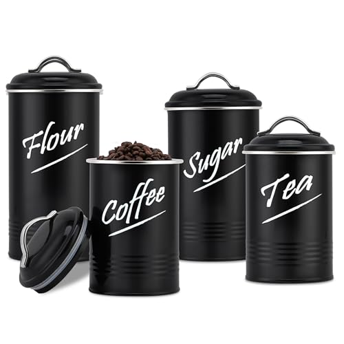 Canisters Sets for The Kitchen, Carbon Steel with Powder Coated Coffee Tea Sugar Flour Farmhouse Kitchen Canisters for Countertop Set of 4(Black)