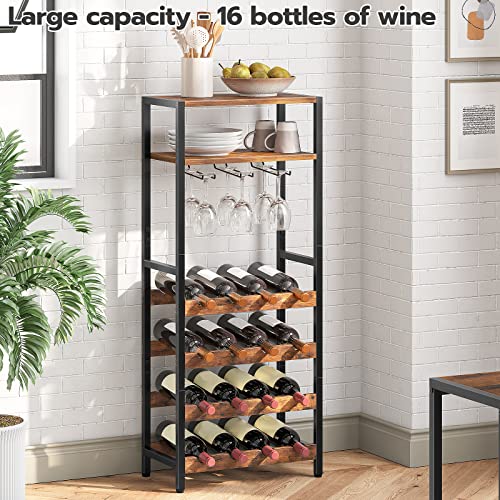 HOOBRO Freestanding Wine Rack, 16-Bottle Wine Storage Rack with Tabletop and Glass Holder, 6-Tier Bar Rack, for Kitchen, Bar, Dining Room, Rustic Brown BF04JJ01