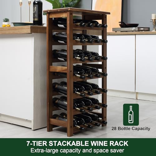 CAPACITY:This floor standing wine rack, with 7 shelves and 4 bottles each, holds 28 wine bottles totally. It is a free stand wine rack for space efficient storage