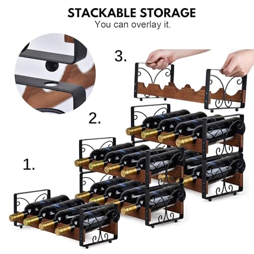 【Stackable】- The wine holder shelf is the layered design, used alone or stacked according to your own need and idea. And you can put it in the cabinet or tabletop, maximize your storage space. 1 set can hold 12 bottles, 3 rows x 4. NOTE: Please tighten the screws to ensure wine rack have the most stable support.