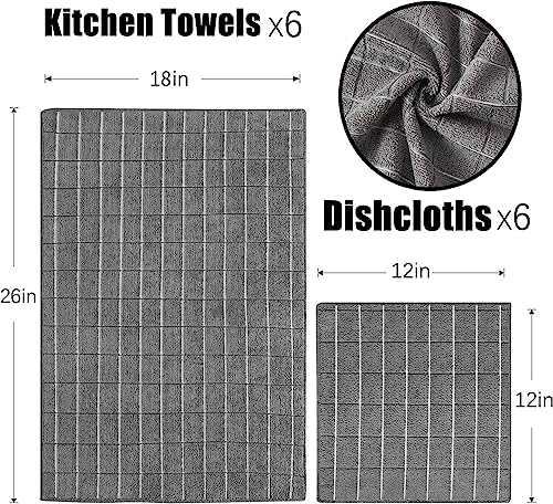 Microfiber Kitchen Towels and Dishcloths Set, 26 X 18 Inch and 12 X 12 Inch, Set of 12 Bulk Lint Free Dish Towels for Drying Dishes, Grey