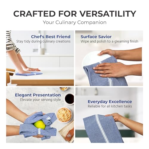 Buy in Bulk, Pay Less – Comes as 12-Towel Set: Know a chef or someone who likes to entertain at home? Our 12 pack of 15 x 25-inch kitchen towels with hanging loop are great gifts for both men and women on Christmas, Thanksgiving, and Mother’s Day. Available in two bright, colorful options: blue and white with a stylish stripe. If you’re not satisfied with our kitchen dish cloths, send the items back for an instant refund/return on Amazon.