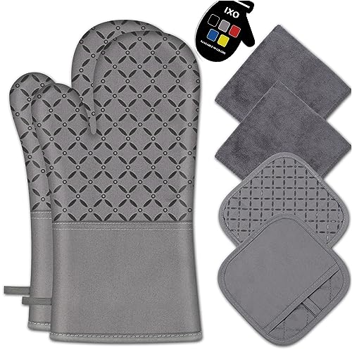 IXO 6Pcs Oven Mitts and Pot Holders, 500°F Heat Resistant Oven Mitts with Kitchen Towels Soft Cotton Lining and Non-Slip Silicone Surface Safe for Baking, Cooking, BBQ