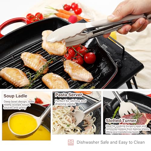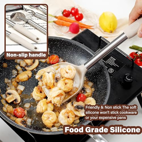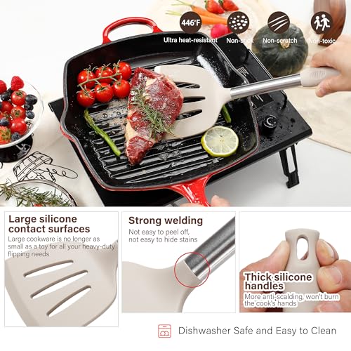 🎁 LARGE STAINLESS STEEL HANDLES KITCHEN UTENSILS: Our kitchen utensils are designed in large sizes, not those ordinary kitchen utensils that look like toys. Silicone heads combined with high quality stainless steel handles ensure lightweight and durable. The thickened anti-scald silicone cover on the handle prevents slipping and also prevents the cook’s hand from getting burned. Strong welding makes the silicone head durable and hard to come off even after long time use.